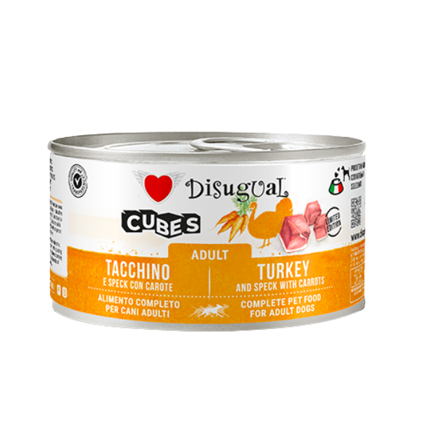 Disugual Dog Adult Cubes 150 gr è un alimento umido completo per cani adulti di tutte le taglie, formulato in Italia con una percentuale elevatissima di carni selezionate. La ricetta combina carne macinata, carne in cubetti e verdure fresche, offrendo una texture originale che stimola la masticazione e la palatabilità.