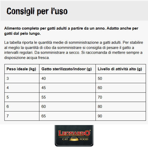 Le dosi sono indicative. Adatta la razione giornaliera in base al temperamento del gatto (pigro vs attivo) e alla condizione fisica.