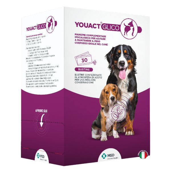 MSD YouAct Glico cane è un mangime complementare in polvere (bustine), parte della linea YouAct Pet di MSD Animal Health. Questo prodotto, disponibile tra i nostri integratori per cani, è specificamente formulato per aiutare nel mantenimento del peso corporeo ideale. È un valido alleato per regolare l’assorbimento intestinale di grassi e glucosio, aumentare il senso di sazietà e attenuare la fame.