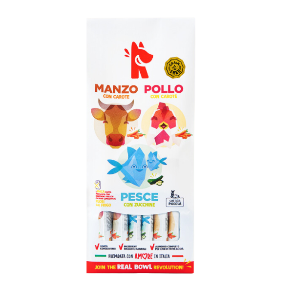 Composizione: Pesce (60%) (merluzzo 33%, sardine 27%), patate (22%), zucchine (6%), olio di semi di girasole (2,8%), olio di semi di lino, sostanze minerali.